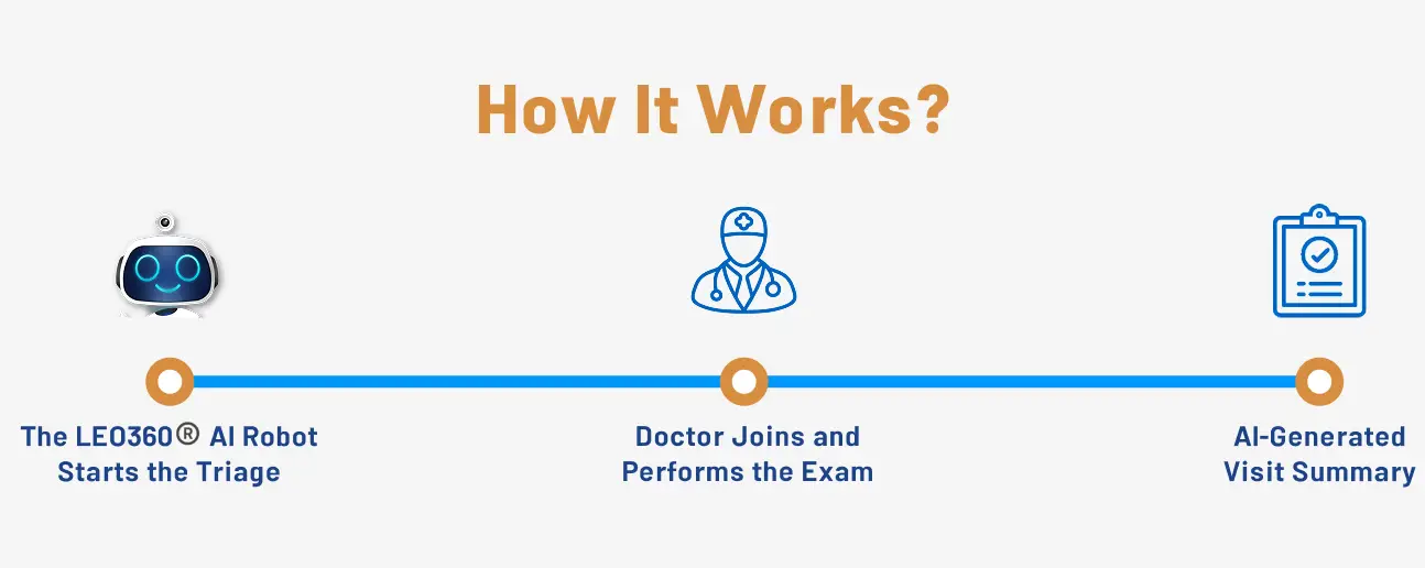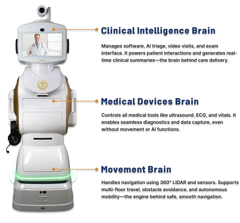 Unlike any traditional telehealth systems, LEO360® AI Robot is powered by three specialized and independent AI cores, each designed to control a critical aspect of clinical operation. These “brains” can operate separately, ensuring unmatched stability, speed, and reliability in high-stakes healthcare environments.