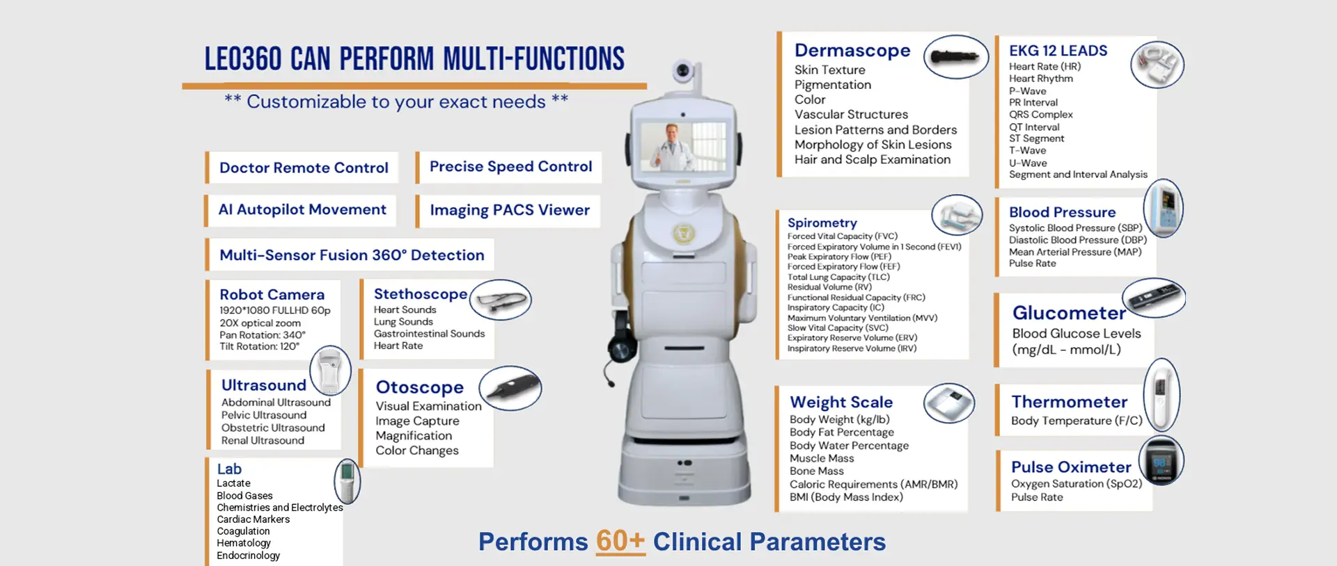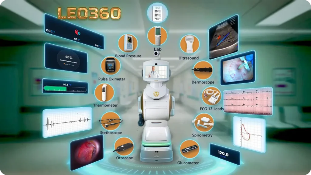 LEO360® AI Robot is a telepresence and workflow support platform designed to enhance connectivity, communication, and collaboration in healthcare settings. It is not itself a medical device, nor intended to diagnose, monitor, or treat any medical condition.Any compatible medical devices or diagnostic instruments used alongside LEO360® are operated under their own regulatory approvals and remain within the clinical responsibility of the attending healthcare provider.