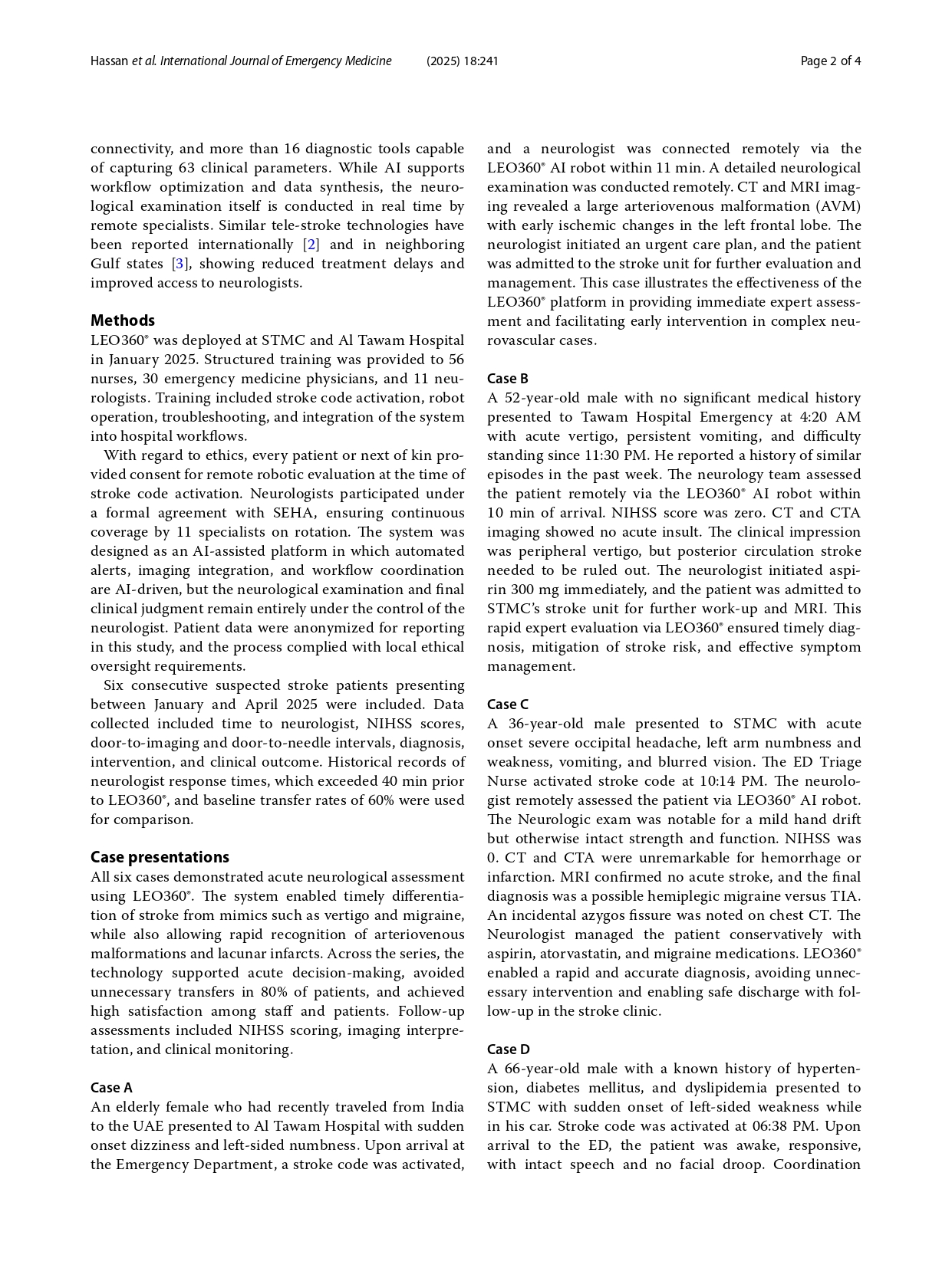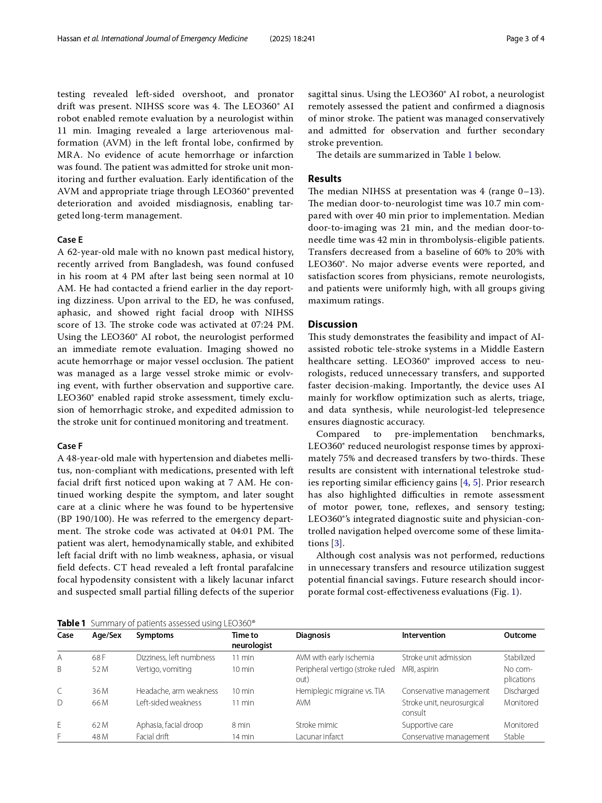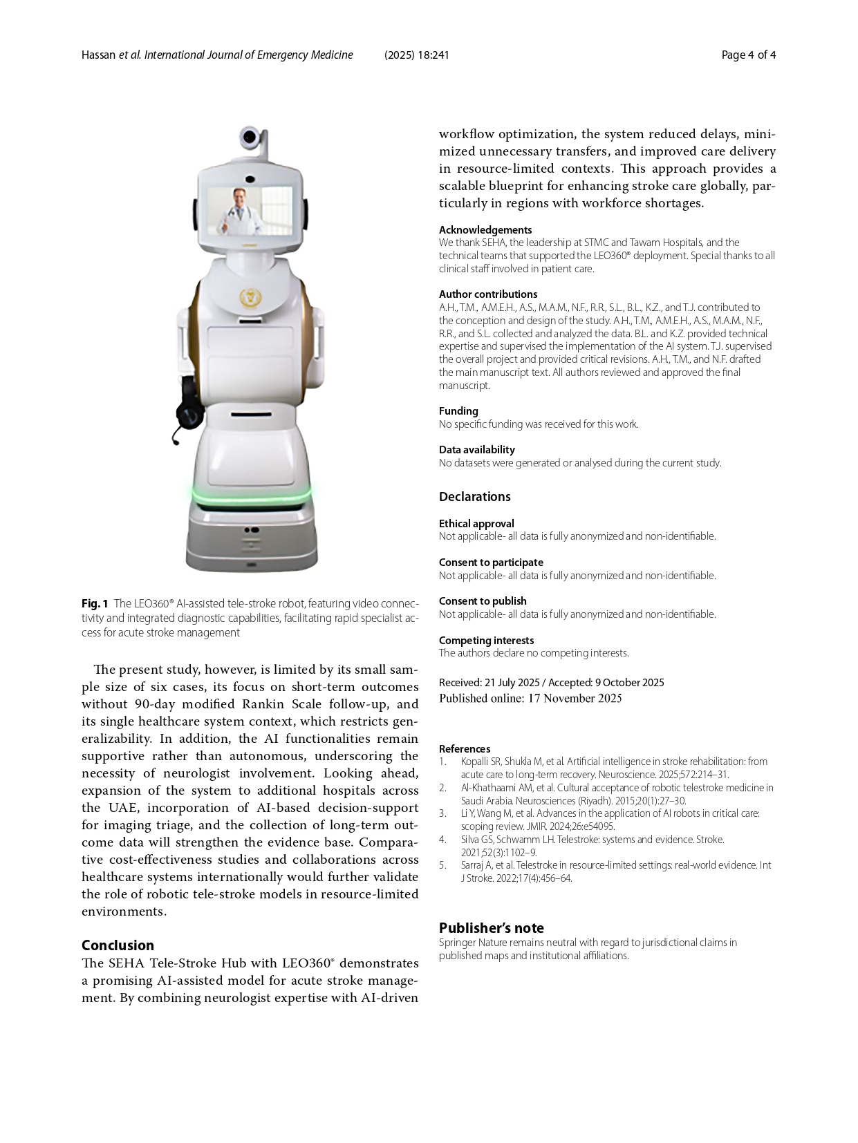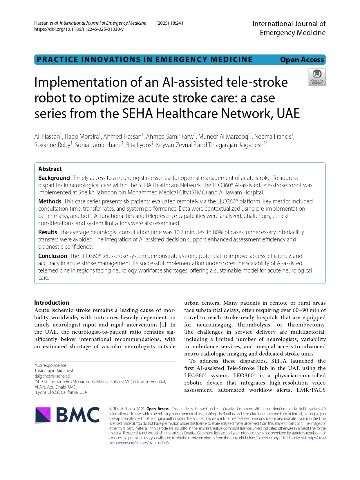 The SEHA Tele-Stroke Hub with LEO360® demonstrates a promising AI-assisted model for acute stroke management. By combining neurologist expertise with AI-driven workflow optimization, the system reduced delays, minimized unnecessary transfers, and improved care delivery in resource-limited contexts. This approach provides a scalable blueprint for enhancing stroke care globally, particularly in regions with workforce shortages.